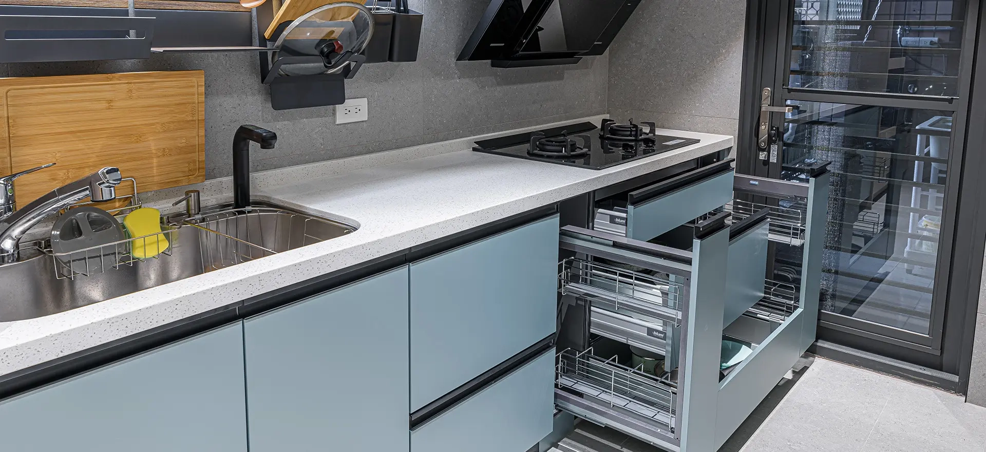 中性色調搭配:棕╳灰╳藍內外廚房設計