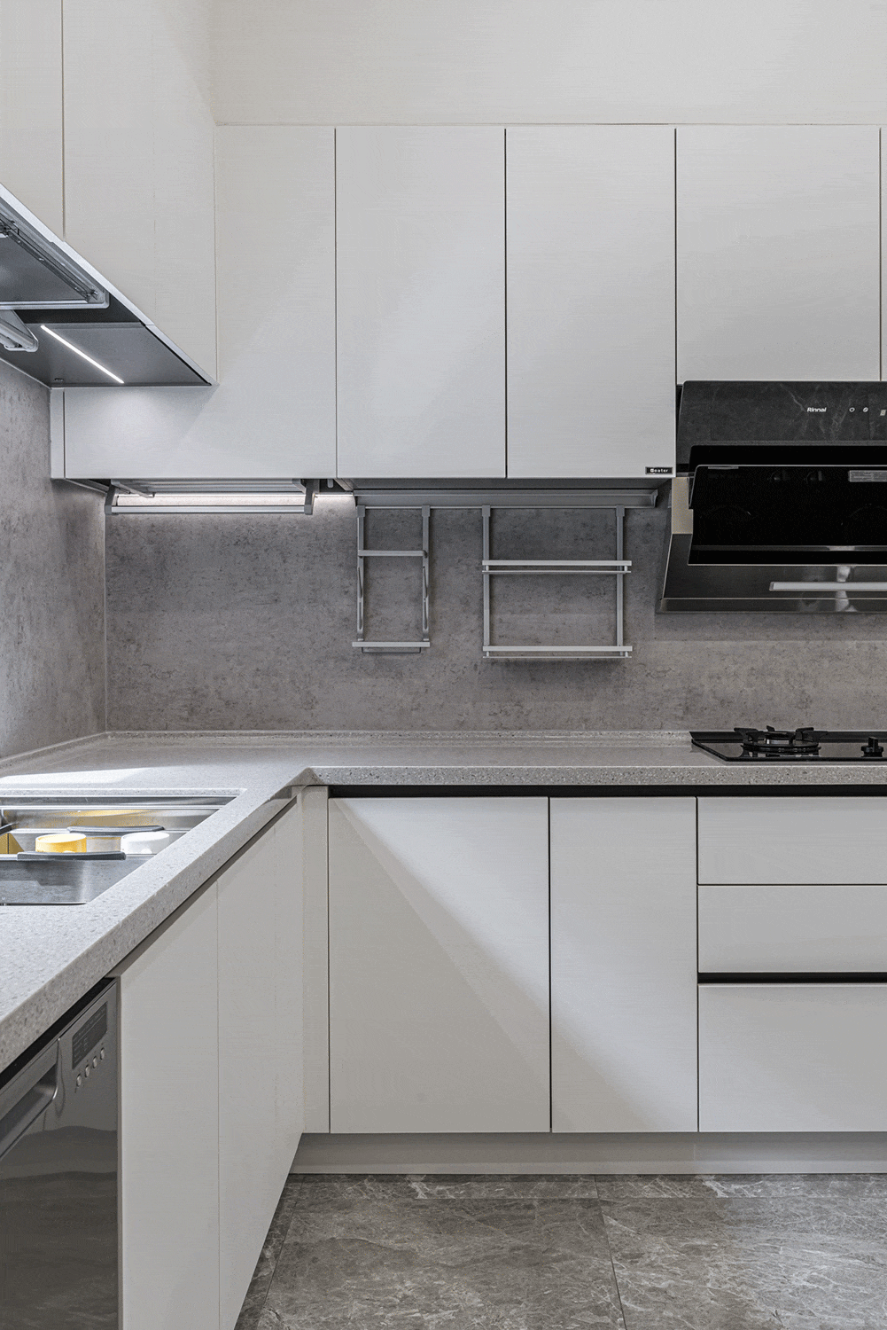 廚房以霧白與石材為基調,打造出現代感與自然元素交融的空間。
