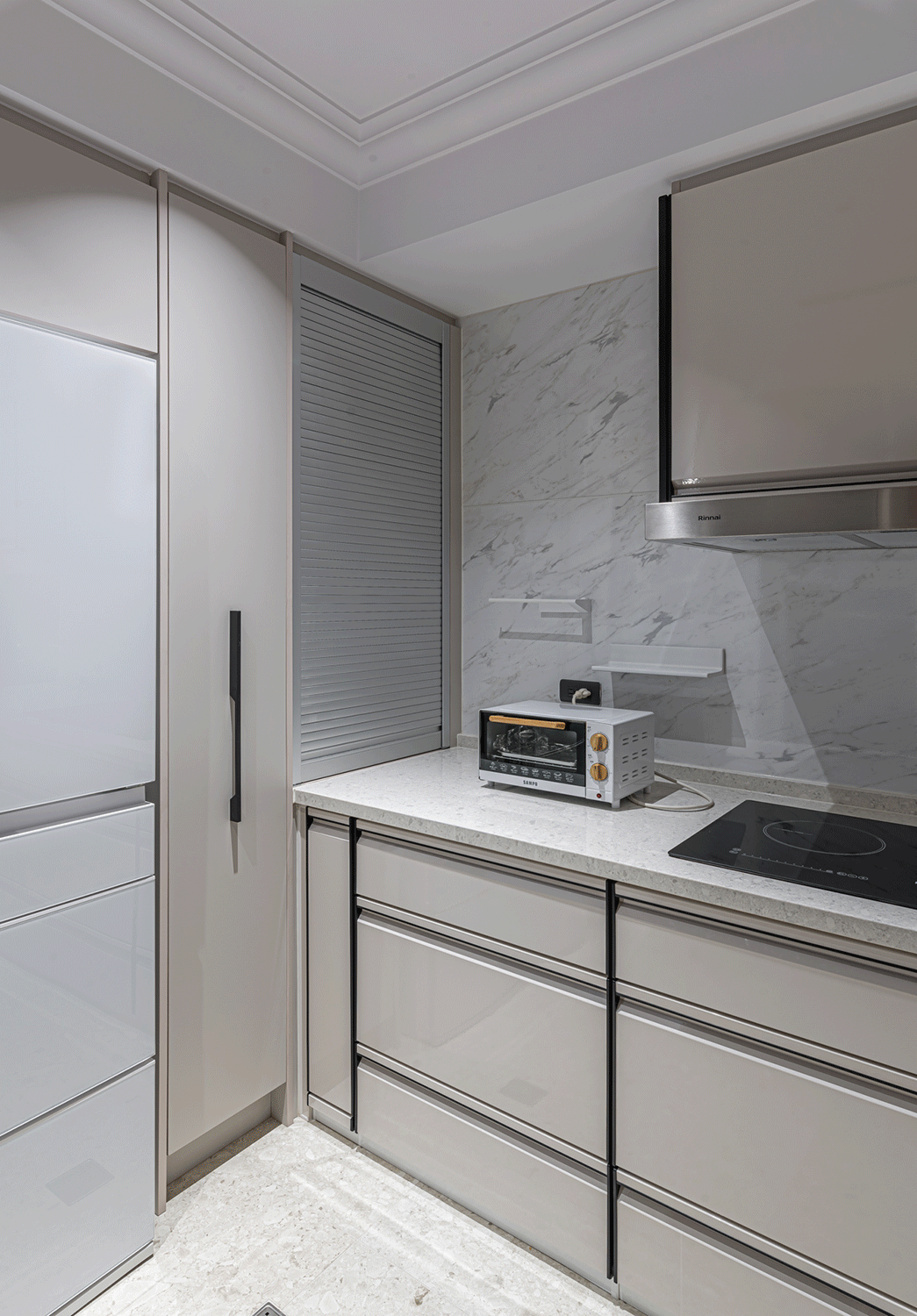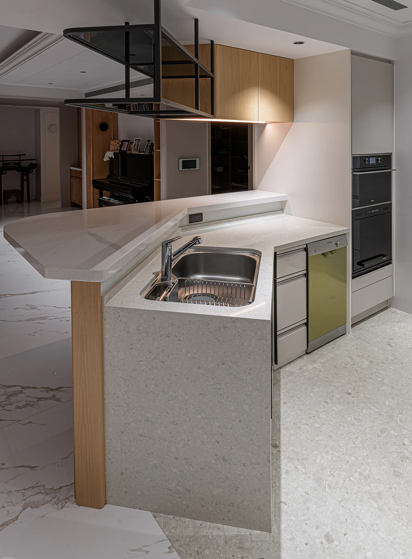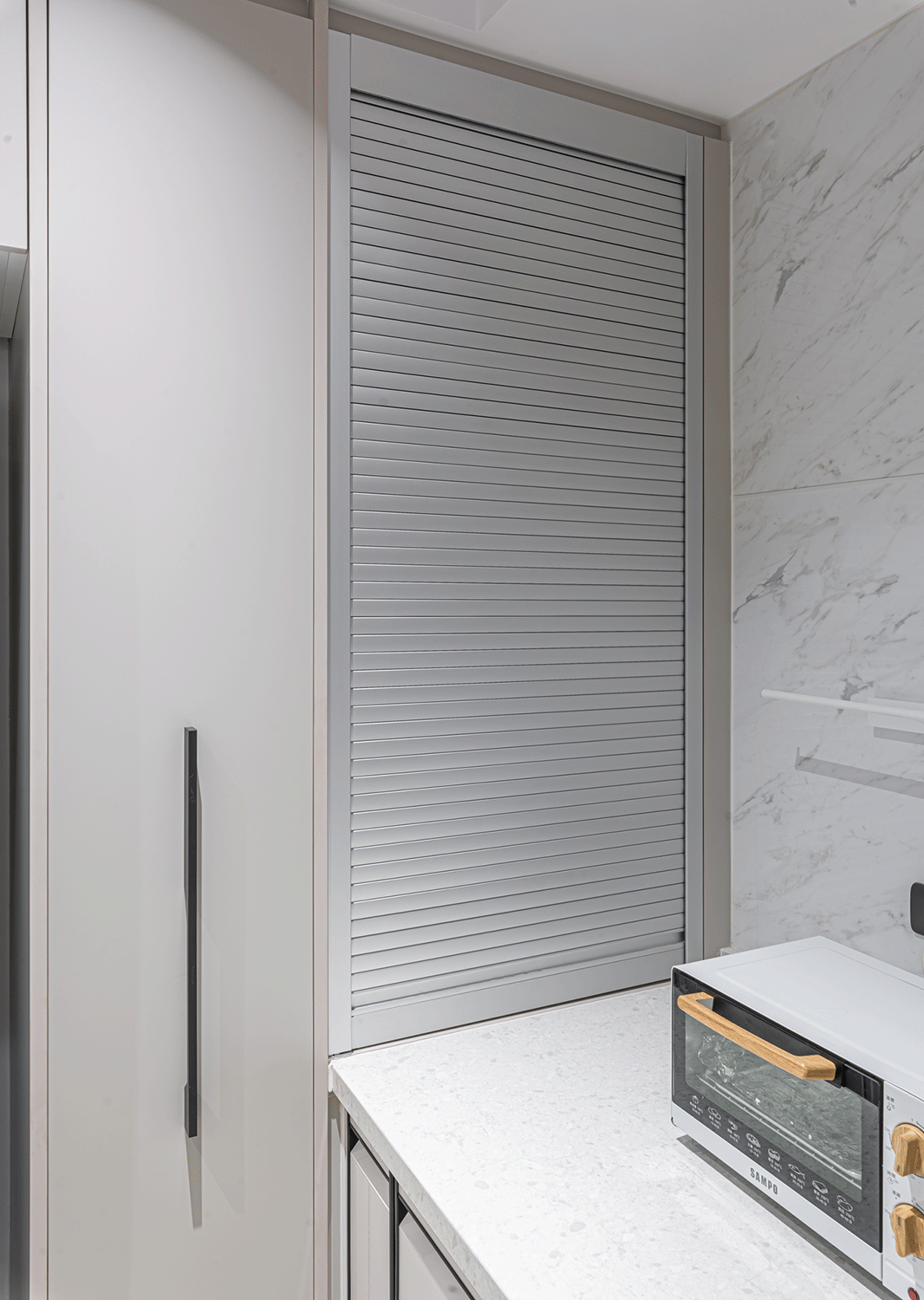 在極簡外殼之下,藏著極致的實用思維。直立式把手配置大怪物連動拉籃,讓大量乾貨與調味品能被整齊歸納並一目了然,搭配流暢的拉取手感,實現優雅的備餐體驗。轉角處則配置鋁捲門,收束電器的繁雜視覺。