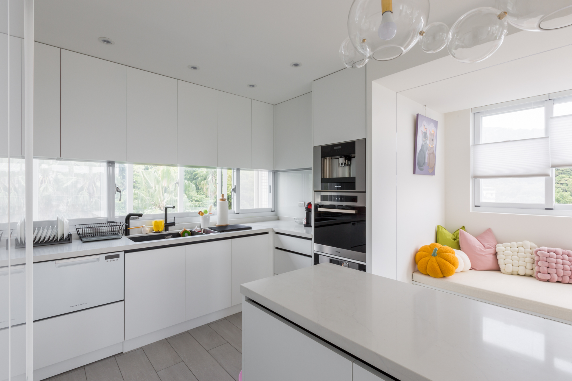 在生活上所追求的簡單而完美,潔白北歐風空間,讓白色生活美學進駐家中,圍塑淨透輕盈、明亮舒適的質感生活,這是身為專業化妝師的屋主許小花對新家的嚮往,翻新廿年中古屋的老態,同時重視針對生活需求量身打造場域設定,客廳不一定是家庭重心之所在,而用餐卻是重要的生活體驗,從備料、烹調到用餐,每個環節都是生活樂趣,更重要的,餐廚空間是夫妻倆最常窩在這裡談天說地、工作放空的最佳所在。許小花期待在簡約乾淨的空間風格下,擁有兼備時尚美型外觀和實用高機能性的餐廚規劃,襯著山林美景,在家享受自煮的愜意時光。