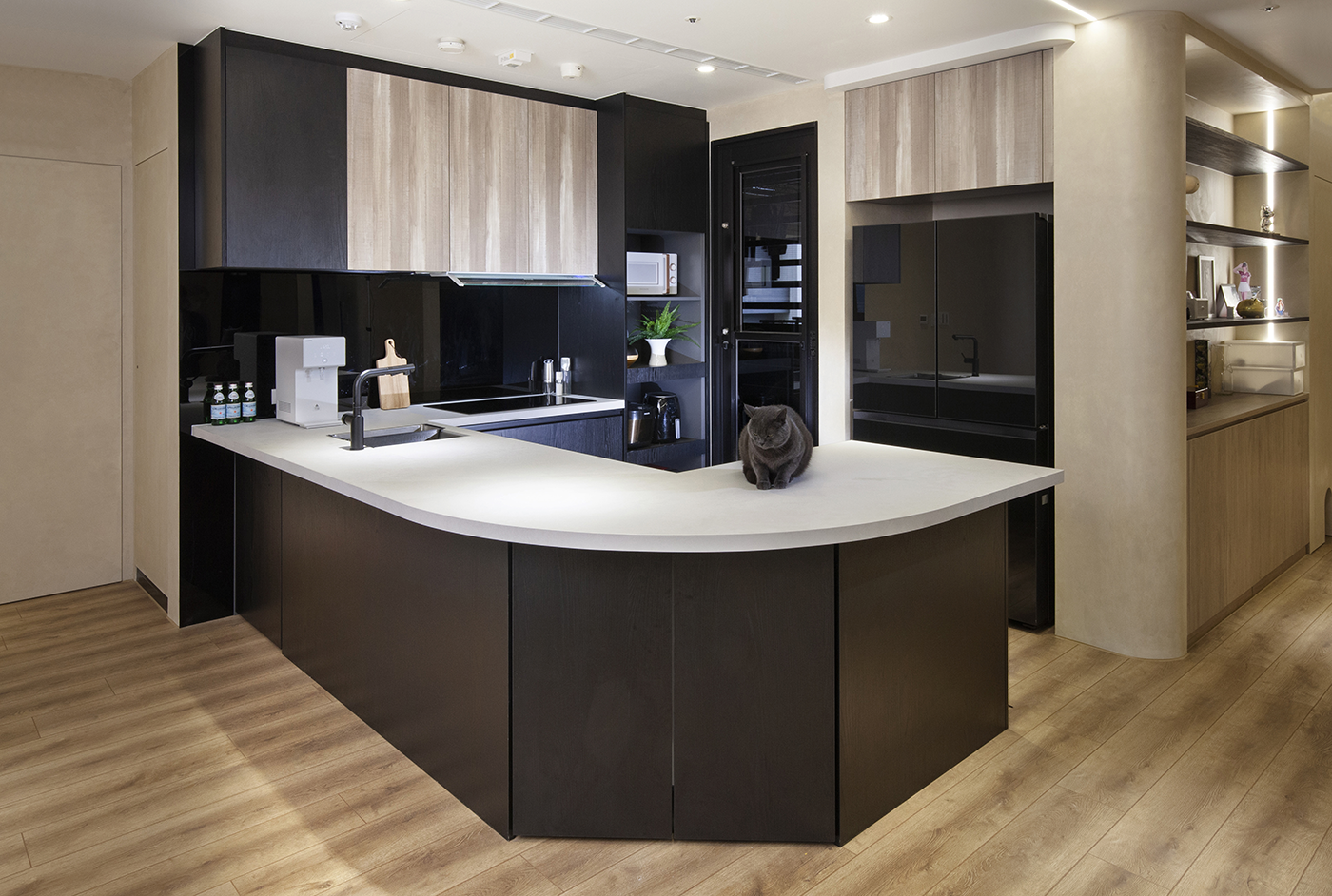 廚房主要配色以黑木紋與橡木,呈現出現代感與自然元素並存的視覺效果。橡木為整體帶來柔和感,使廚房空間與居家融合一體。U字型圓弧吧台使用愷薩金石檯面,與牆面塗料設計相互呼應。